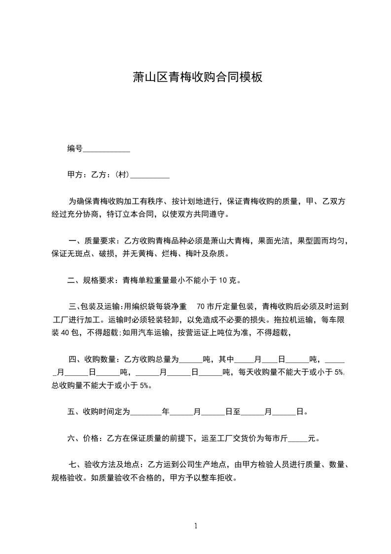 一、质量要求:乙方收购青梅品种必须是萧山大青梅,果面光洁,果型圆而均匀,保证无斑点、破损,并无黄梅、烂梅、梅叶及杂质。