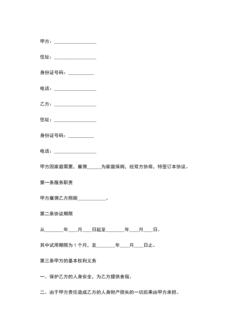 甲方因家庭需要,雇佣______为家庭保姆,经双方协商,特签订本协议。