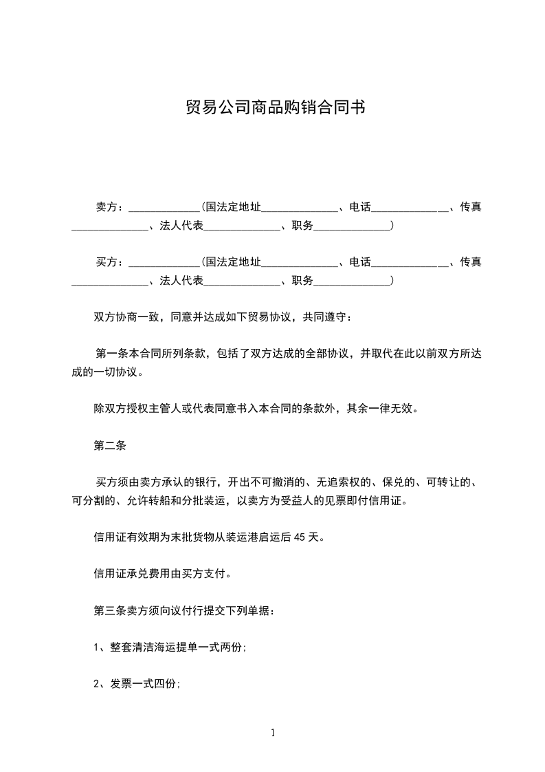 卖方:_____________(国法定地址______________、电话______________、传真______________、法人代表______________、职务______________)