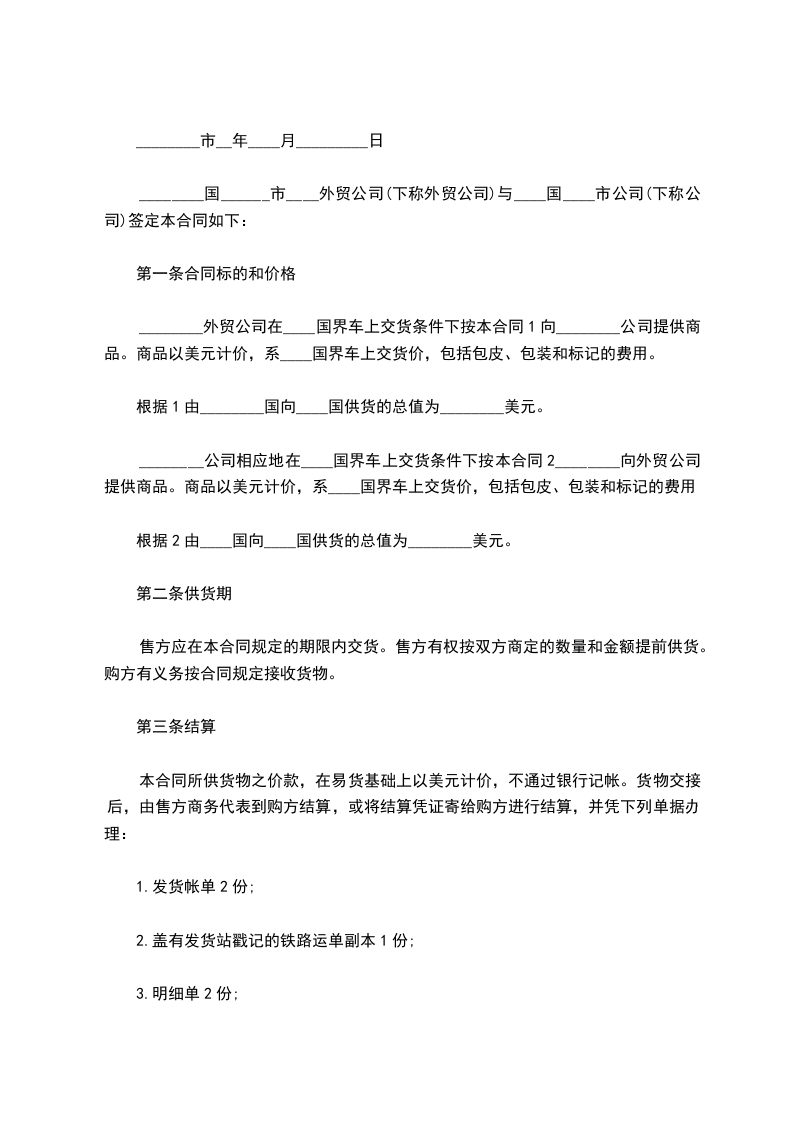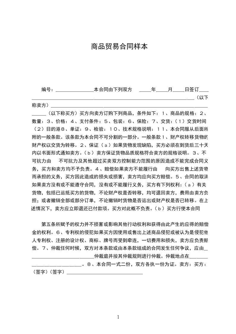 1、合同规定的每批交货日前20天,卖方应将合同号、数量、预定交货期写信告诉买方,以便买方租船订舱。