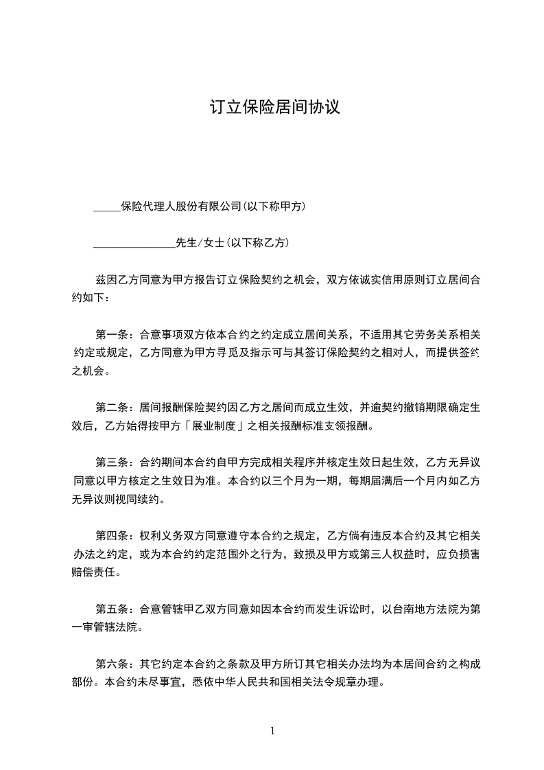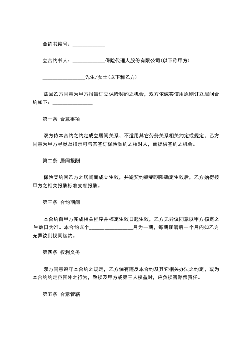 第一条合意事项双方依本合约之约定成立居间关系,不适用其它劳务关系相关约定或规定,乙方同意为甲方寻觅及指示可与其签订保险契约之相对人,而提供签约之机会。