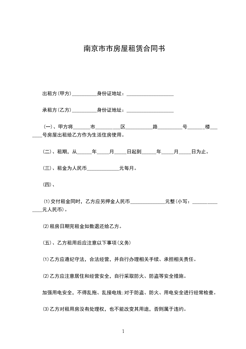 (一)、甲方将_______市__________区___________路__________号_______楼_______号房屋出租给乙方作为生活住房使用。
