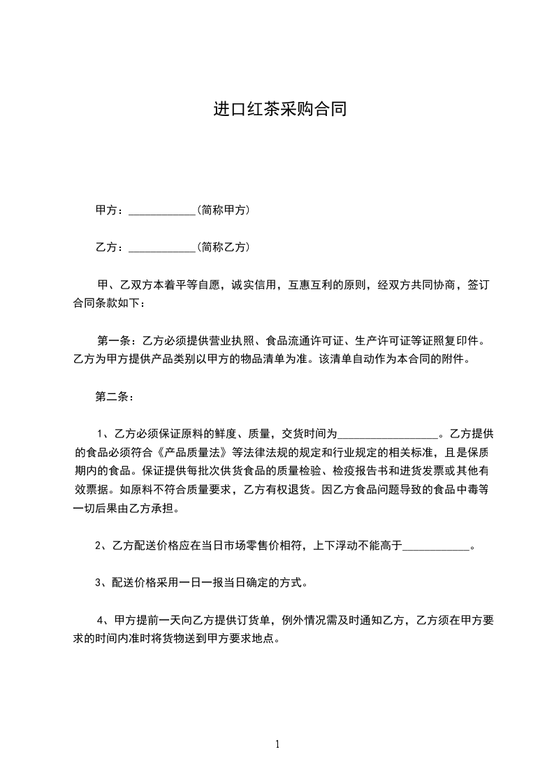 乙方向甲方购买一批红茶叶,为使交易顺利完成,经双方议定,订立本合同,以资共同恪守。