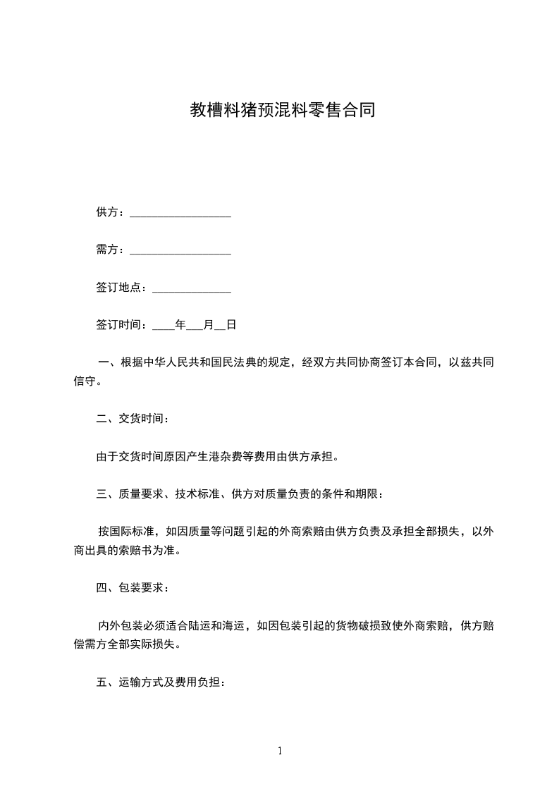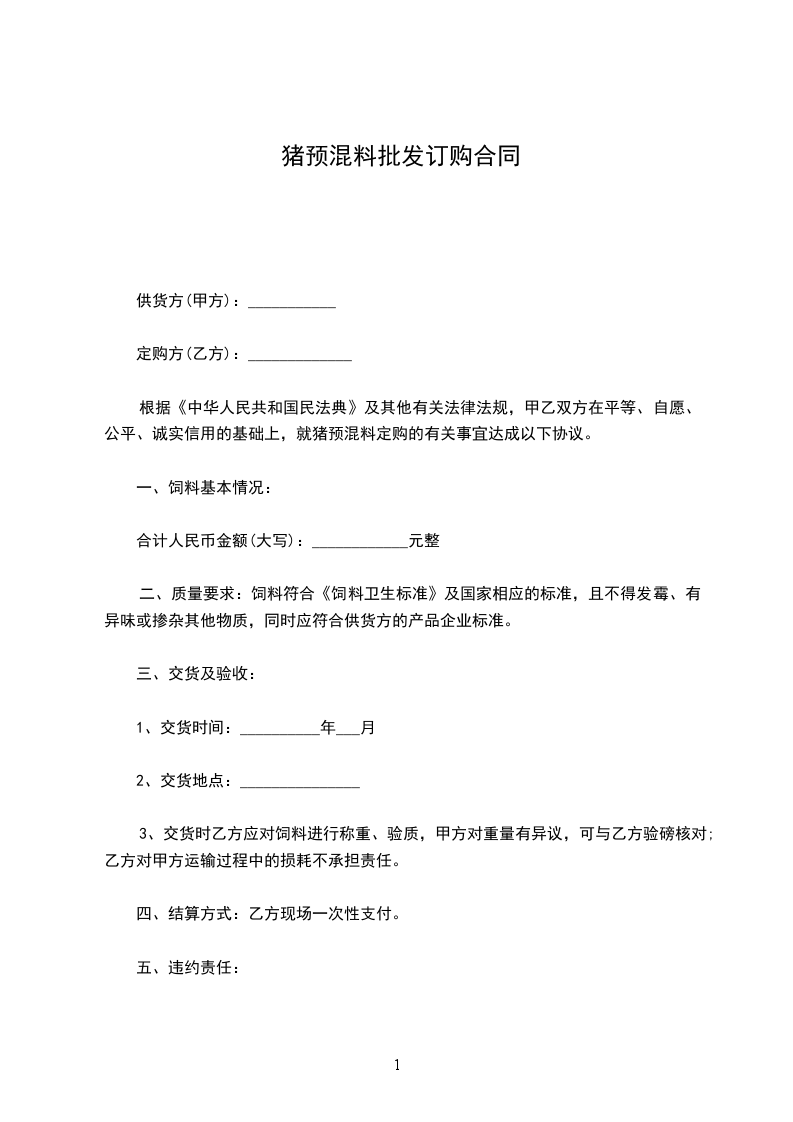 根据《中华人民共和国民法典》及其他有关法律法规,甲乙双方在平等、自愿、公平、诚实信用的基础上,就猪预混料定购的有关事宜达成以下协议。