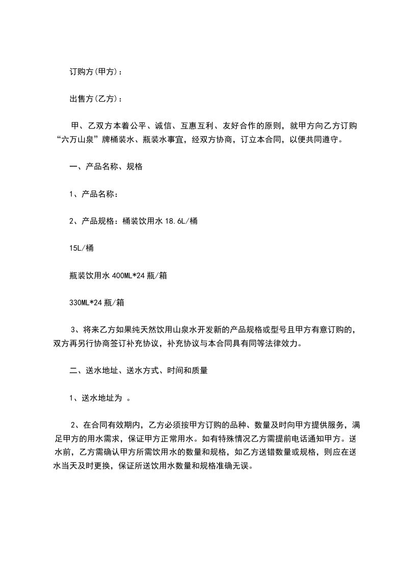甲、乙双方本着公平、诚信、互惠互利、友好合作的原则,就甲方向乙方订购“六万山泉”牌桶装水、瓶装水事宜,经双方协商,订立本合同,以便共同遵守。