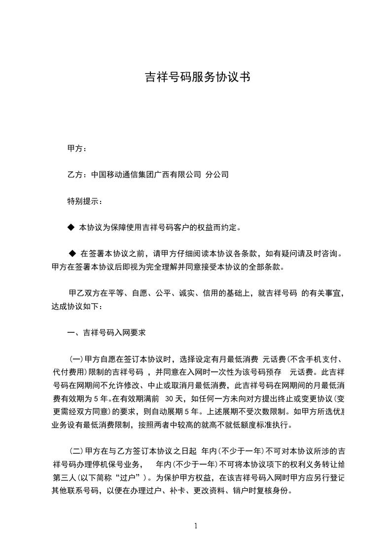 注:甲方办理吉祥号码的过户、客户信息变更、拆机复装、销户、分合户、补卡业务的,需由甲方本人持有效证件原件至广西区内乙方营业厅通过人工视频审核办理。