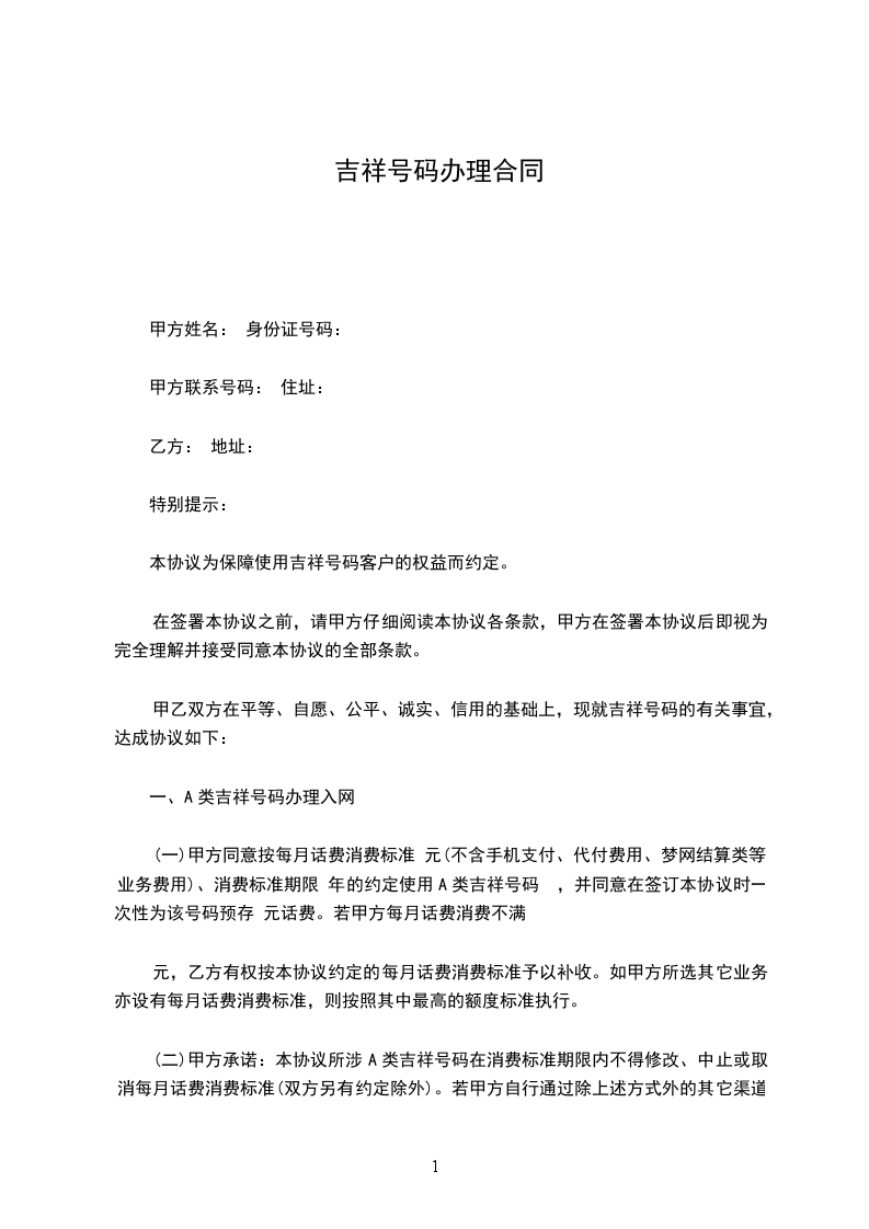甲乙双方在平等、自愿、公平、诚实、信用的基础上,现就吉祥号码的有关事宜,达成协议如下: