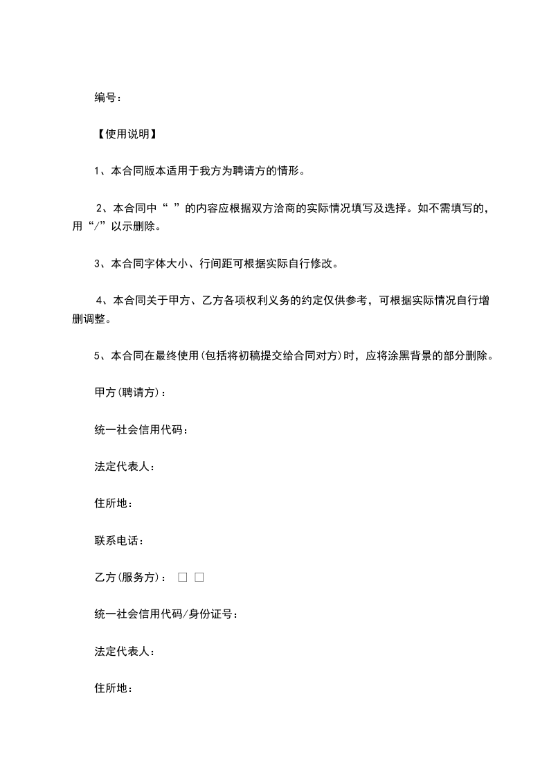 5、本合同在最终使用(包括将初稿提交给合同对方)时,应将涂黑背景的部分删除。