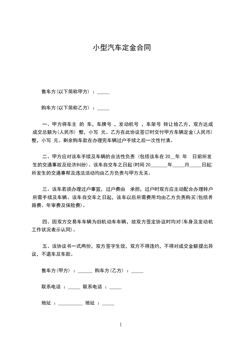 ﹝合同车辆﹞定金的交付:乙方预付购车定金人民币(大写): 。