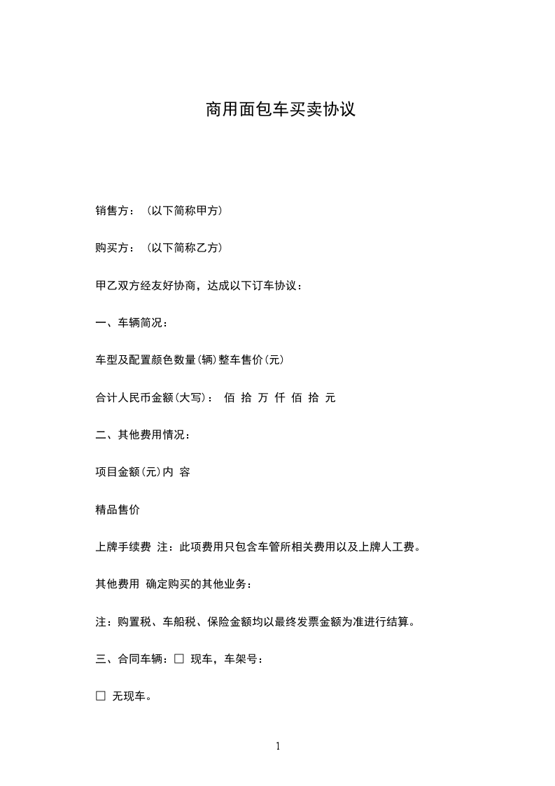 1、乙方已交来购车定金(大写) 拾 万 仟 佰 拾 元(¥: 元),余额在乙方提车时一次性付清。