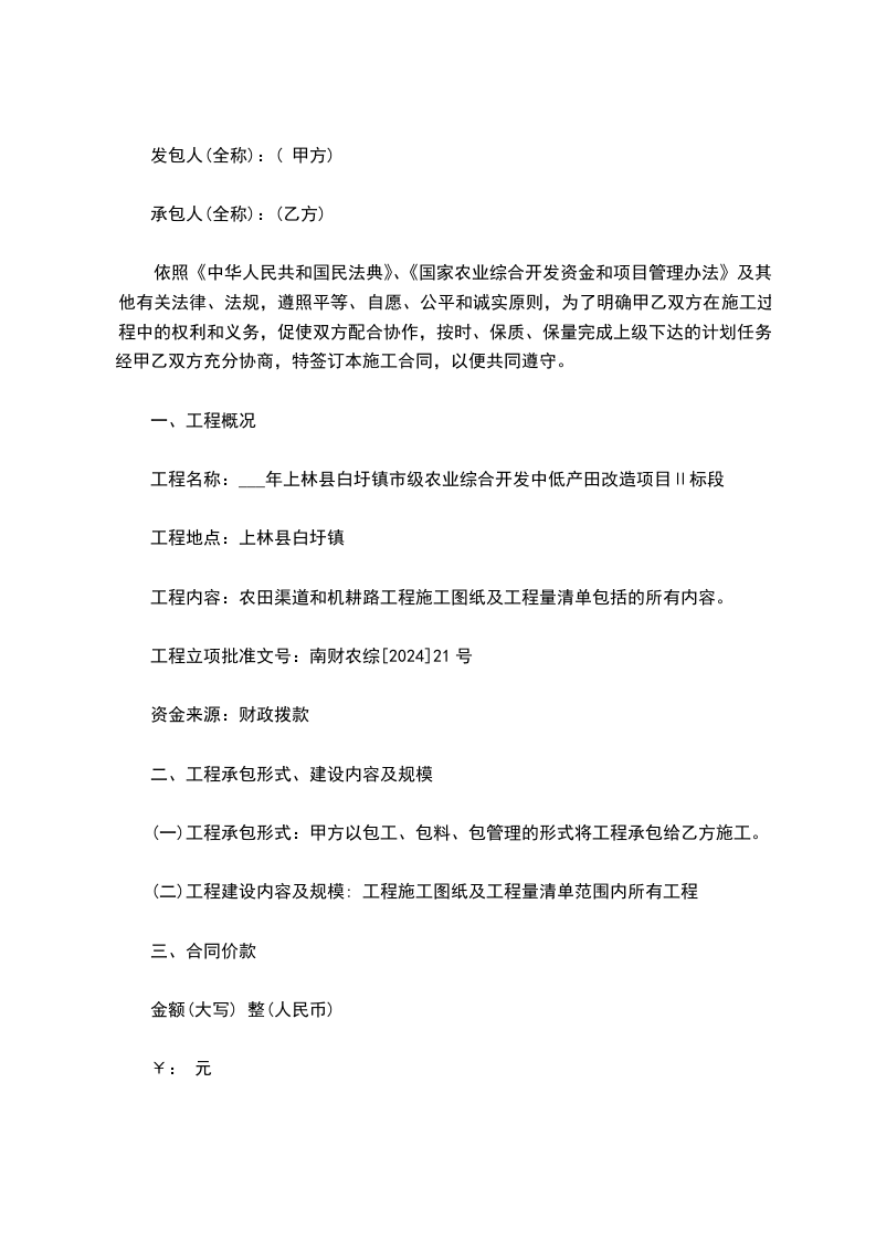 依照《中华人民共和国民法典》、《国家农业综合开发资金和项目管理办法》及其他有关法律、法规,遵照平等、自愿、公平和诚实原则,为了明确甲乙双方在施工过程中的权利和义务,促使双方配合协作,按时、保质、保量完成上级下达的计划任务,经甲乙双方充分协商,特签订本施工合同,以便共同遵守。