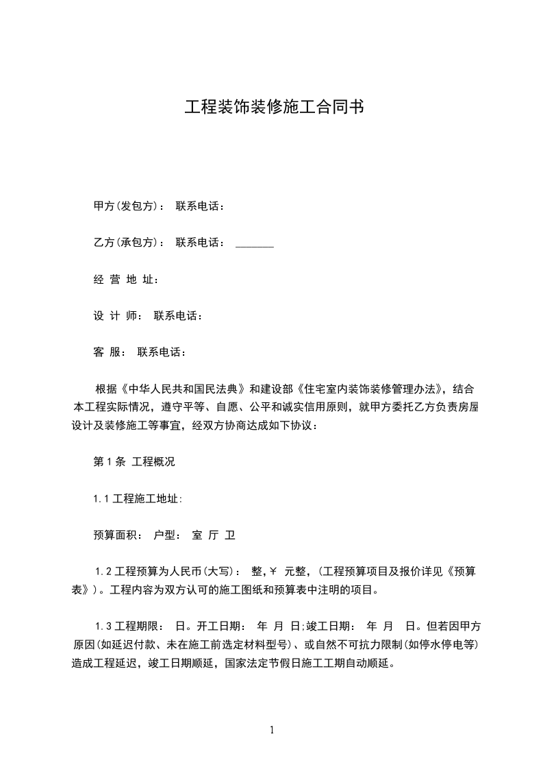 1.3工程期限: 日。开工日期: 年 月 日;竣工日期: 年 月 日。但若因甲方原因(如延迟付款、未在施工前选定材料型号)、或自然不可抗力限制(如停水停电等)造成工程延迟,竣工日期顺延,国家法定节假日施工工期自动顺延。