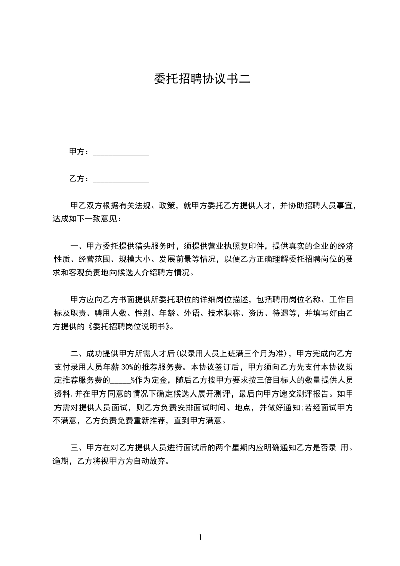 二、成功提供甲方所需人才后(以录用人员上班满三个月为准),甲方完成向乙方支付录用人员年薪30%的推荐服务费。本协议签订后,甲方须向乙方先支付本协议规定推荐服务费的_____%作为定金,随后乙方按甲方要求按三倍目标人的数量提供人员资料.并在甲方同意的情况下确定候选人展开测评,最后向甲方递交测评报告。如甲方需对提供人员面试,则乙方负责安排面试时间、地点,并做好通知;若经面试甲方不满意,乙方负责免费重新推荐,直到甲方满意。