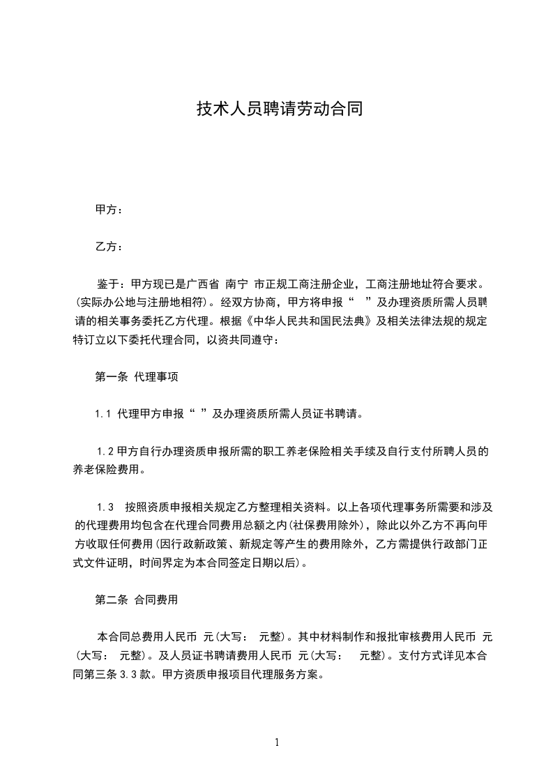 鉴于:甲方现已是广西壮族自治区 南宁 市正规工商注册企业,工商注册地址符合要求。(实际办公地与注册地相符)。经双方协商,甲方将申报“ ”及办理资质所需人员聘请的相关事务委托乙方代理。根据《中华人民共和国民法典》及相关法律法规的规定,特订立以下委托代理合同,以资共同遵守: