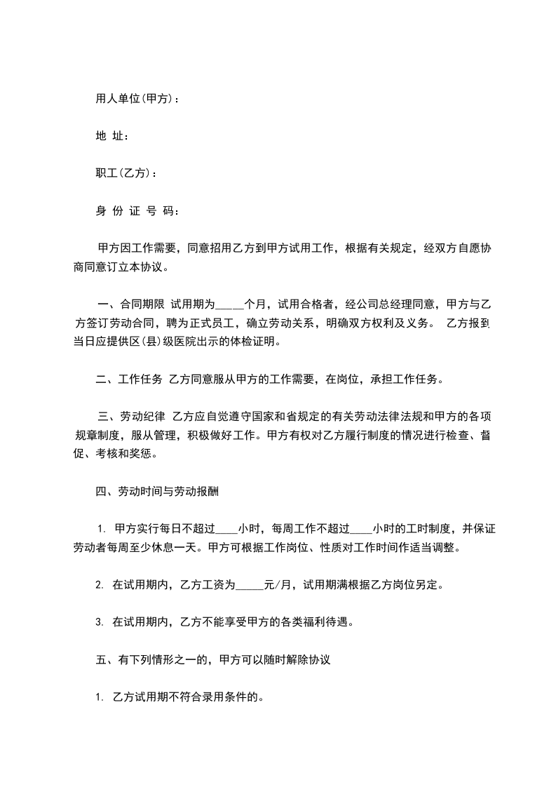一、合同期限 试用期为_____个月,试用合格者,经公司总经理同意,甲方与乙方签订劳动合同,聘为正式员工,确立劳动关系,明确双方权利及义务。 乙方报到当日应提供区(县)级医院出示的体检证明。