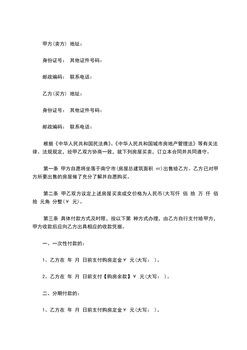 第一条 甲方自愿将坐落于南宁市(房屋总建筑面积 ㎡)出售给乙方。乙方已对甲方所要出售的房屋做了充分了解并自愿购买。