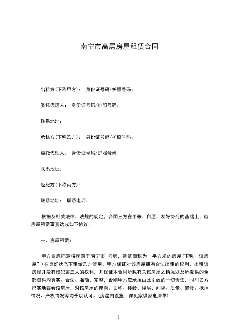 甲方自愿同意将座落于南宁市 号房,建筑面积为 平方米的房屋(下称“该房屋”)在良好状态下租给乙方使用。甲方保证对该房屋拥有合法出租的权利,出租该房屋并没有侵犯第三人的权利,并保证本合同所载有关该房屋之情况以及所提供的全部资料均真实、合法、准确、完整,否则甲方应承担由此引致的一切责任,同时乙方已实地察看该房屋,对该房屋的座向、面积、楼龄、楼层、间隔、质量、装修、抵押情况、产权情况等均予以认可。(房屋内设施,详见家俱家电清单)