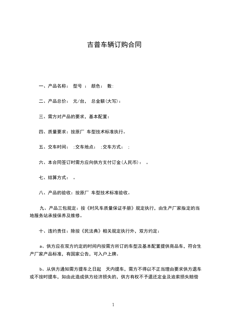 a、供方应在双方约定的时间内按需方所订的车型及基本配置提供商品车,符合生产厂家产品标准,有国家公告,可入户上牌。