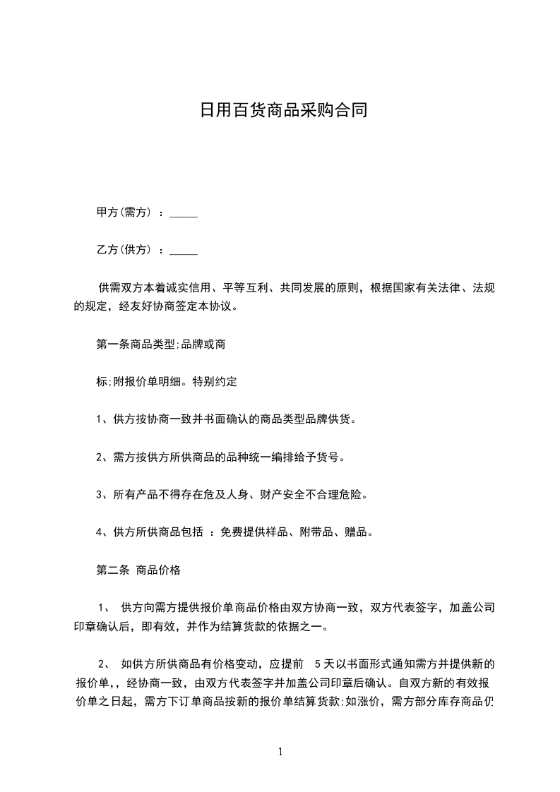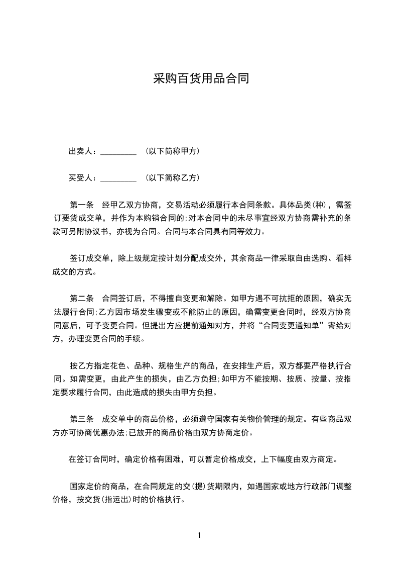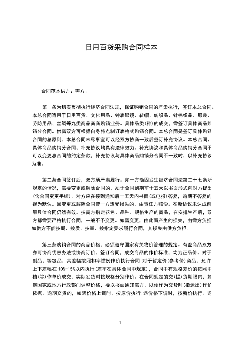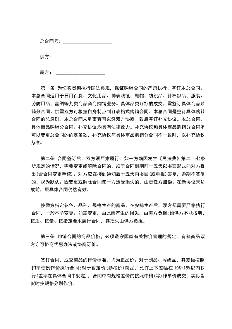 第一条 为切实贯彻执行民法典规,保证购销合同的严肃执行,签订本总合同。