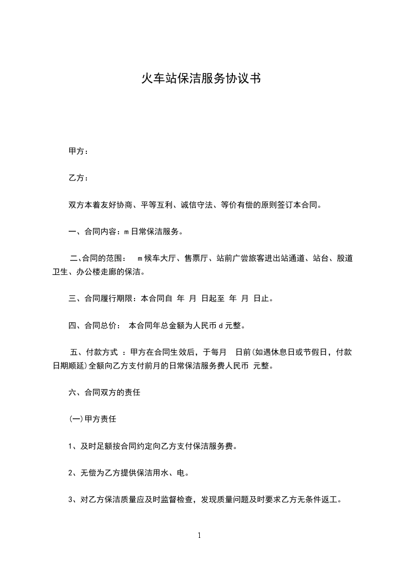 二、合同的范围:候车大厅、售票厅、站前XX、旅客进出站通道、站台、股道卫生、办公楼走廊的保洁。