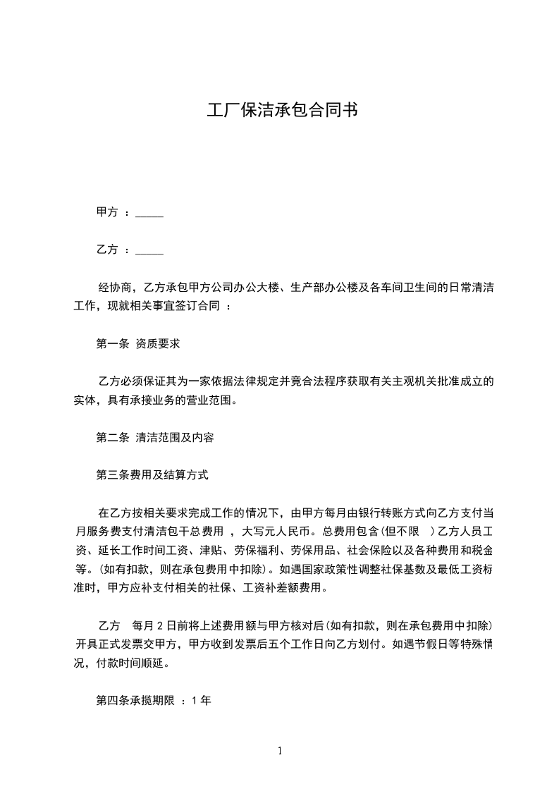 1、清洁工作承包金为每月人民币__________元整(小写:__________¥),一年合计为人民币__________元整(小写:__________¥),上述承包金包括清洁工工资、清洁工具、用品费用、税费等一切费用。