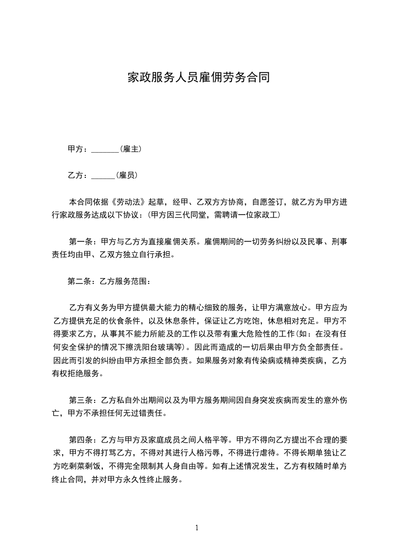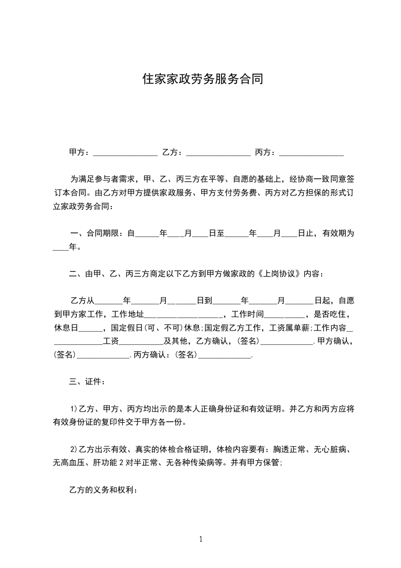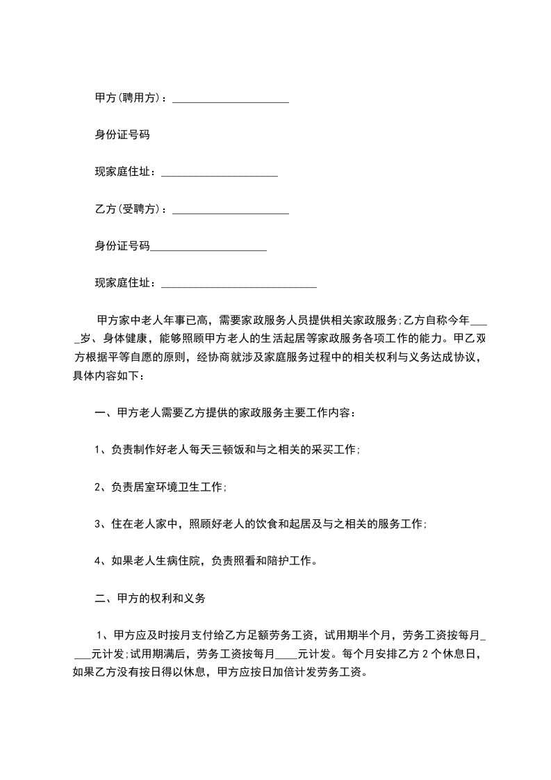 九、用户(乙方)需家政服务员工作,并以月工资结算,应同意每周不少于休息一天,如遇法定假日(春节三天,元旦节一天,五一节一天,国庆节一天)休息,工资照付。