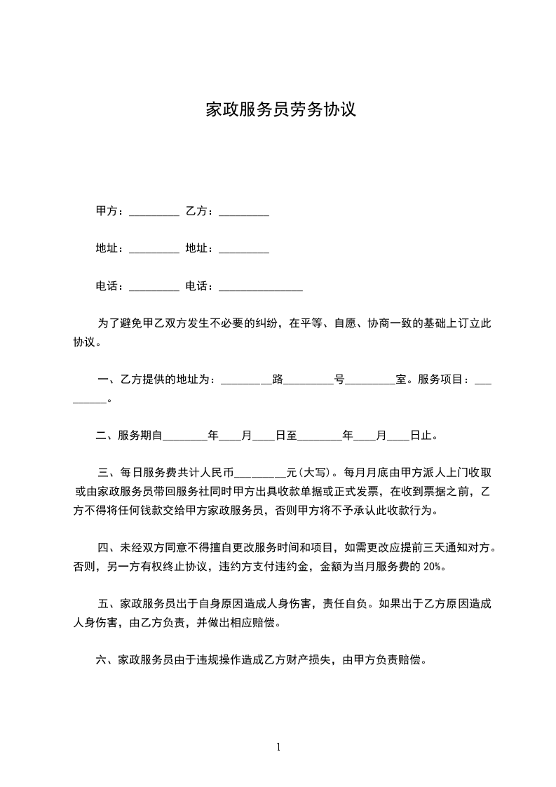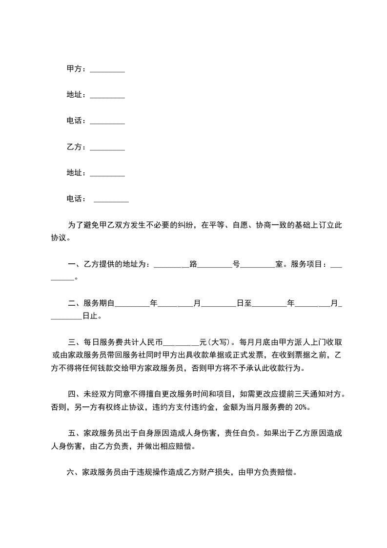 四、未经双方同意不得擅自更改服务时间和项目,如需更改应提前三天通知对方。否则,另一方有权终止协议,违约方支付违约金,金额为当月服务费的20%。
