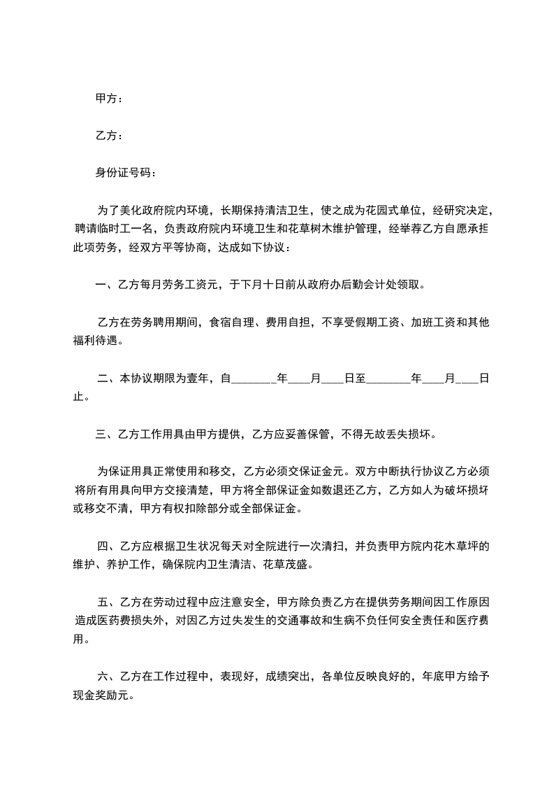 为了美化政府院内环境,长期保持清洁卫生,使之成为花园式单位,经研究决定,聘请临时工一名,负责政府院内环境卫生和花草树木维护管理,经举荐乙方自愿承担此项劳务,经双方平等协商,达成如下协议: