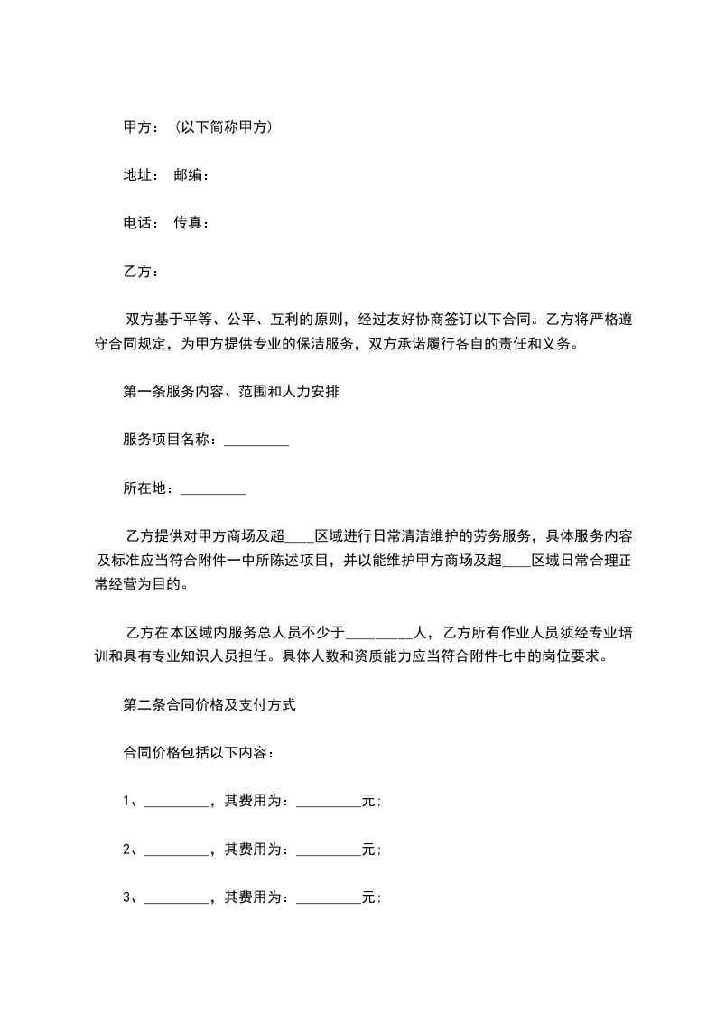 乙方提供对甲方商场及超____区域进行日常清洁维护的劳务服务,具体服务内容及标准应当符合附件一中所陈述项目,并以能维护甲方商场及超____区域日常合理正常经营为目的。