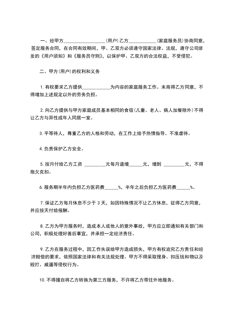 一、经甲方__________________(用户)乙方____________(家庭服务员)协商同意,签定服务合同,在合同有效期间,甲、乙双方必须遵守国家法律、法规,遵守公司颁发的《用户须知》和《服务员守则》,以保护甲、乙双方的合法权益,不受侵犯。