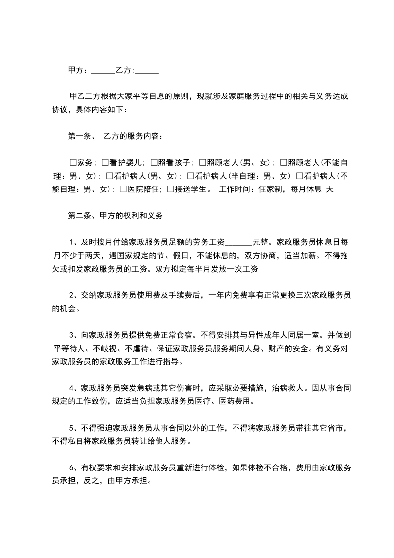 1.有权要求乙方提供____________为内容的家庭服务工作。未商得乙方同意,不得增加上述规定以外的劳务负担。