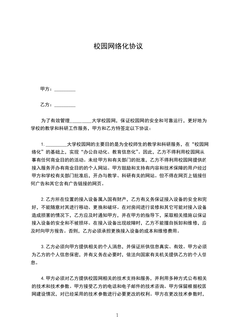 为了有效管理_________大学校园网,保证校园网的安全和可靠运行,更好地为学校的教学和科研工作服务,甲方和乙方特签定以下协议:
