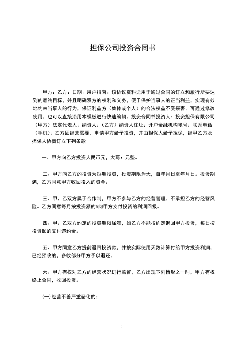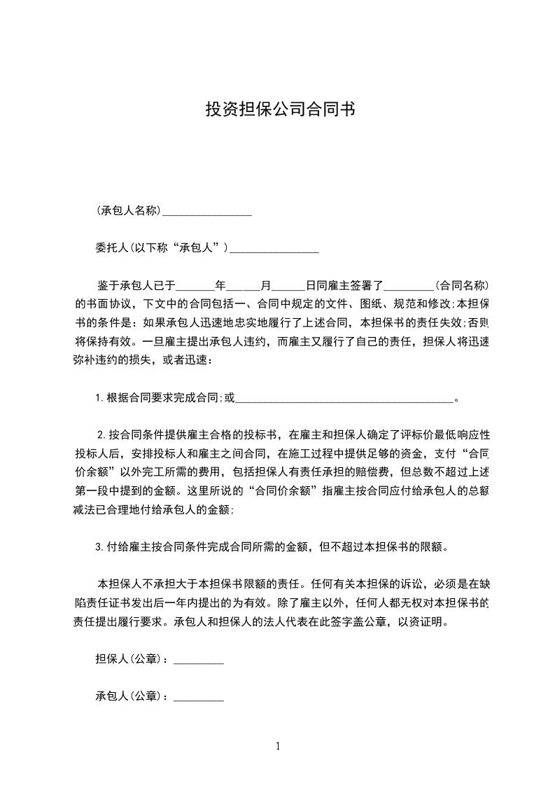 鉴于承包人已于_______年______月______日同雇主签署了_________(合同名称)的书面协议,下文中的合同包括一、合同中规定的文件、图纸、规范和修改;本担保书的条件是:如果承包人迅速地忠实地履行了上述合同,本担保书的责任失效;否则将保持有效。一旦雇主提出承包人违约,而雇主又履行了自己的责任,担保人将迅速弥补违约的损失,或者迅速: