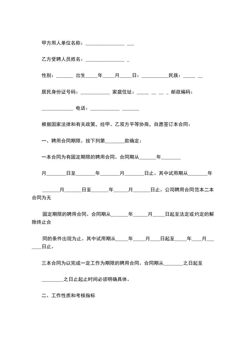 固定期限的聘用合同。合同期从_______年______月_____日起至法定或约定的解除终止合