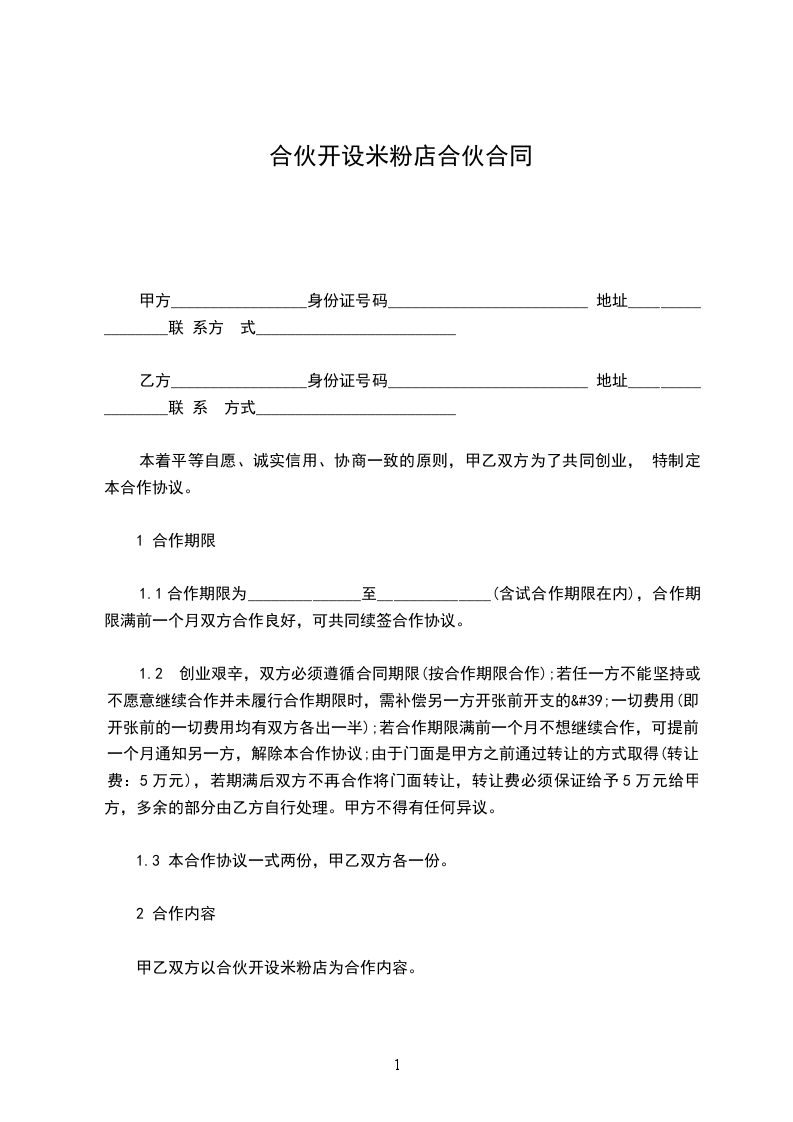 甲乙双方以合伙开设米粉店为合作内容。