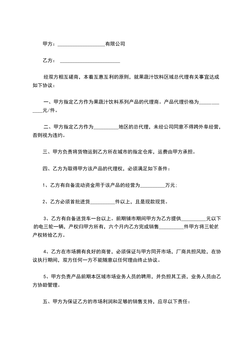 经双方相互磋商,本着互惠互利的原则,就果蔬汁饮料区域总代理有关事宜达成如下协议: