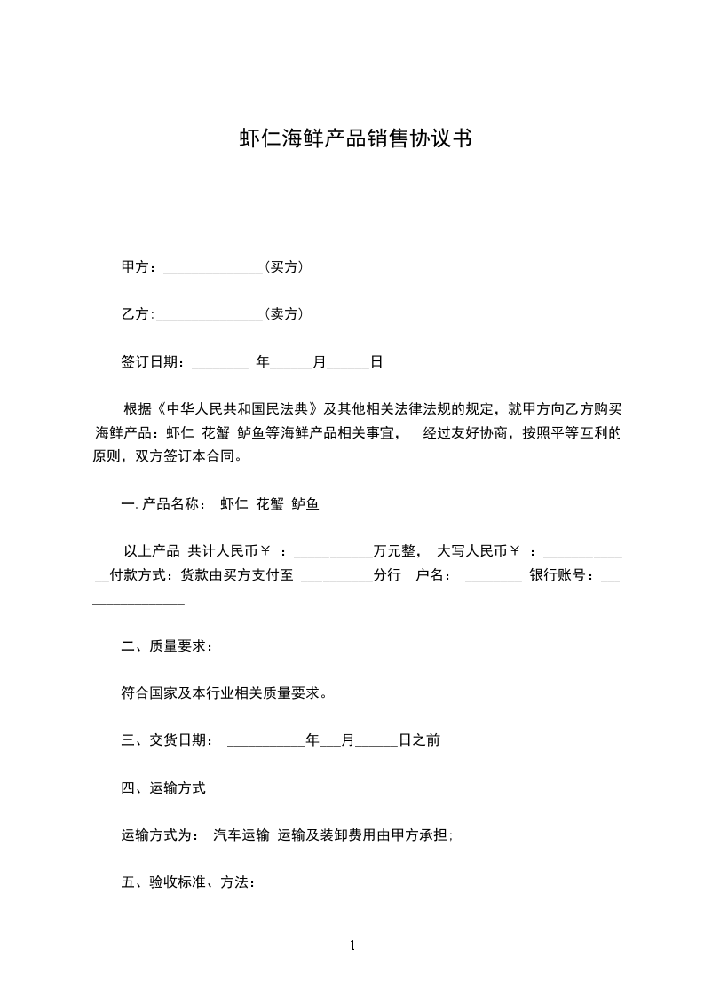 虾仁海鲜产品销售协议书