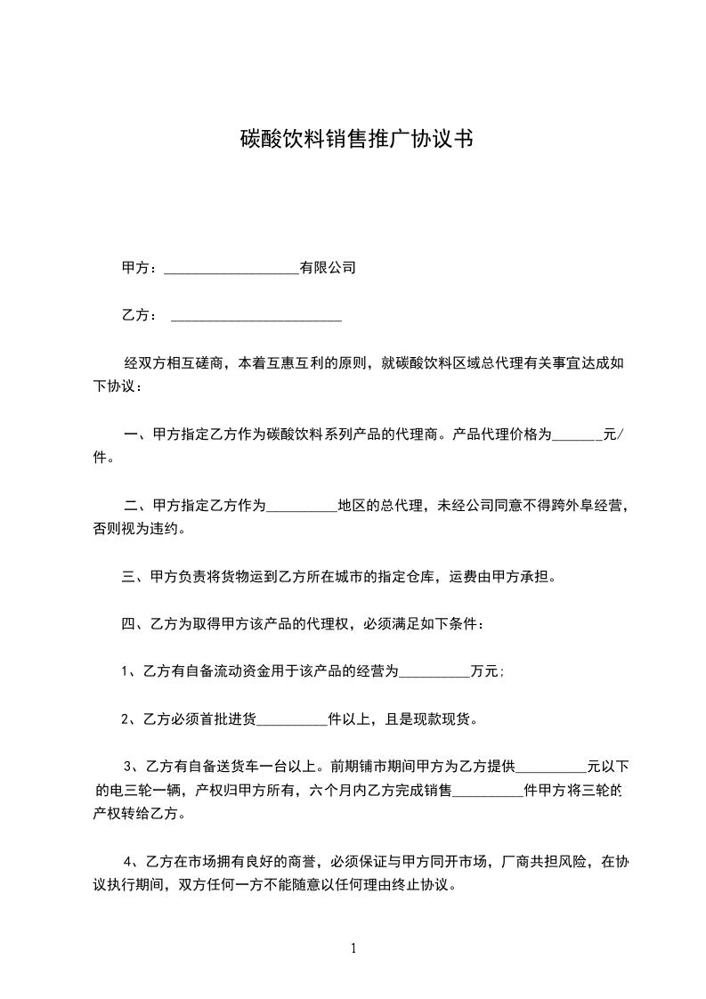 一、甲方指定乙方作为碳酸饮料系列产品的代理商。产品代理价格为_______元/件。