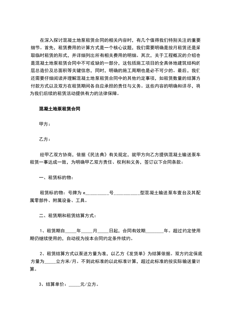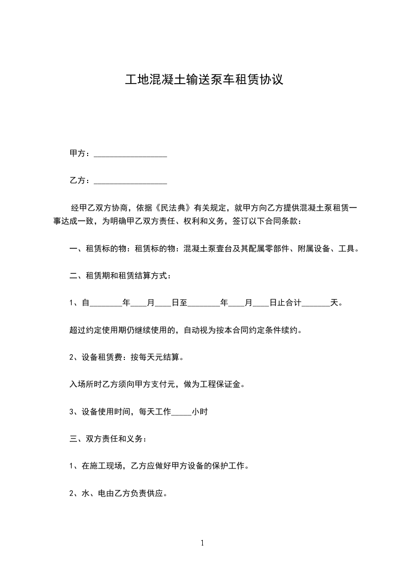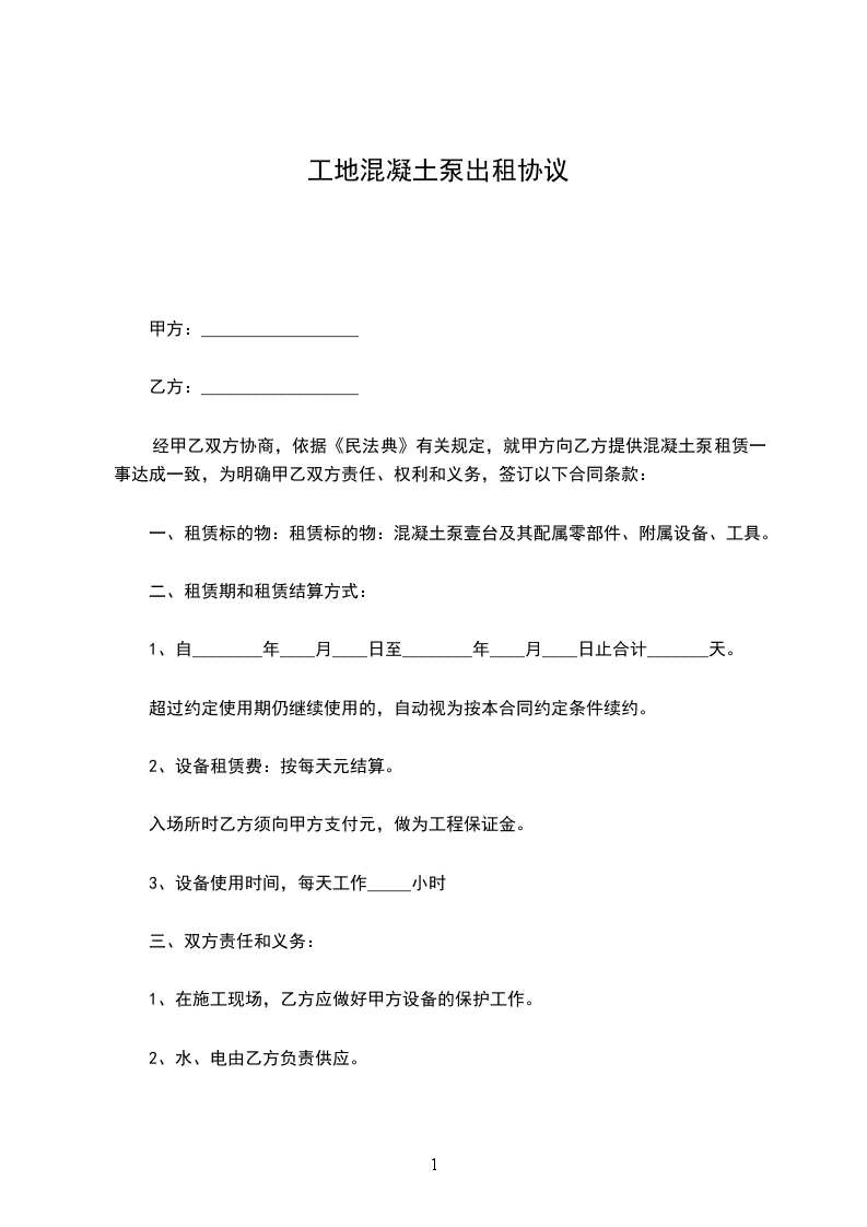 经甲乙双方协商,依据《民法典》有关规定,就甲方向乙方提供混凝土泵租赁一事达成一致,为明确甲乙双方责任、权利和义务,签订以下合同条款: