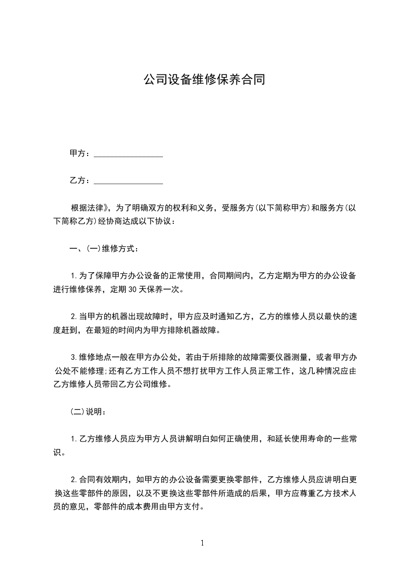 1.为了保障甲方办公设备的正常使用,合同期间内,乙方定期为甲方的办公设备进行维修保养,定期30天保养一次。