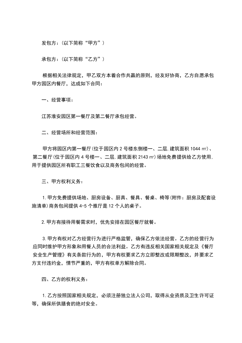 根据相关法律规定,甲乙双方本着合作共赢的原则,经友好协商,乙方自愿承包甲方园区内餐厅,达成如下合同:
