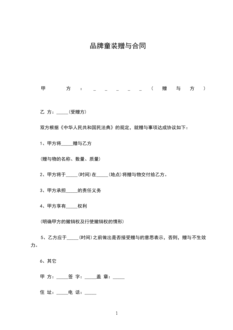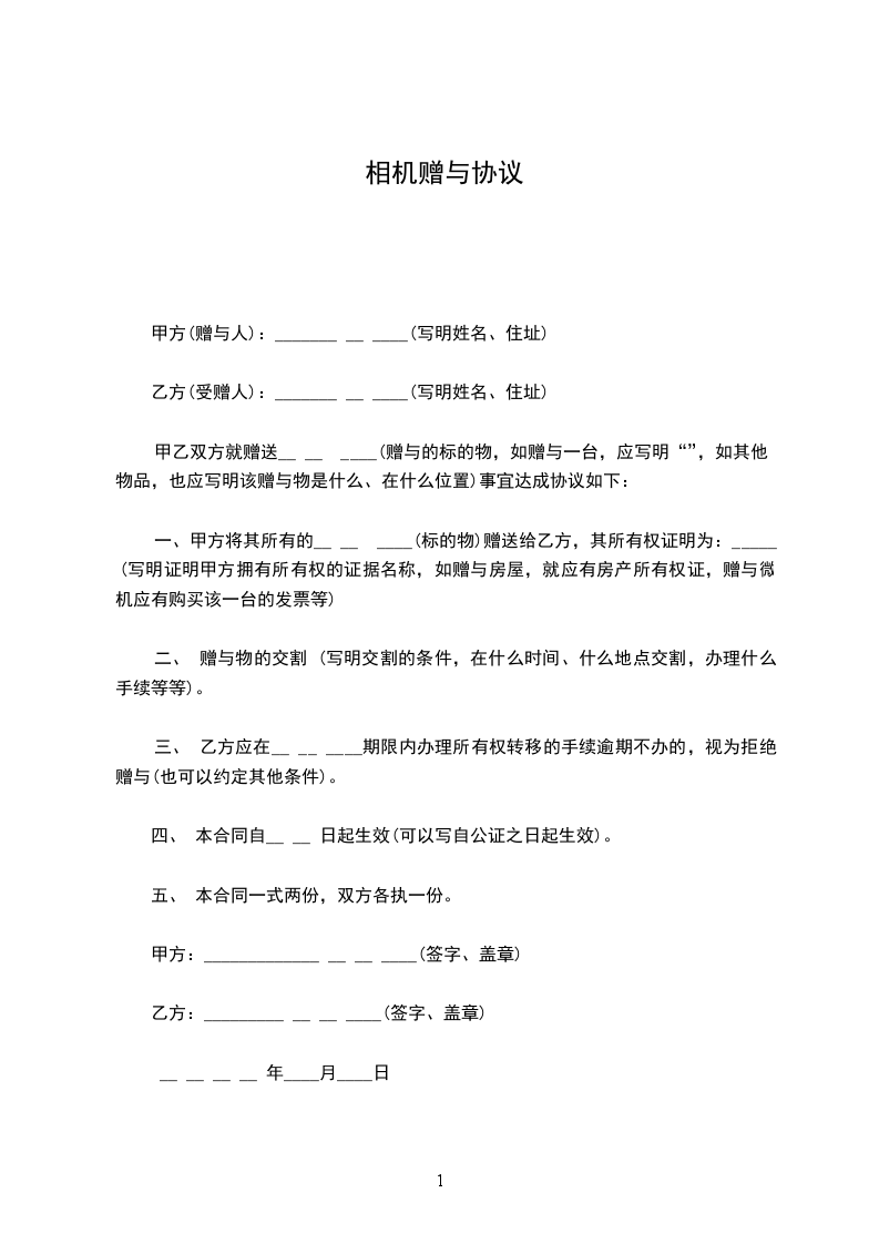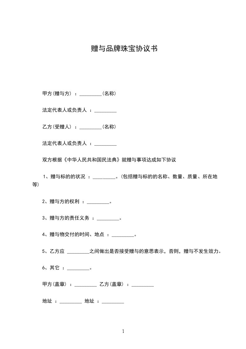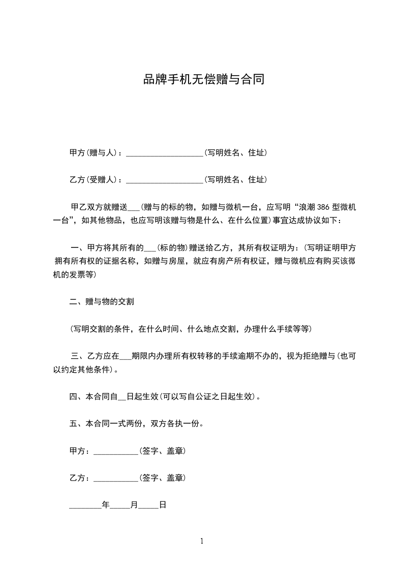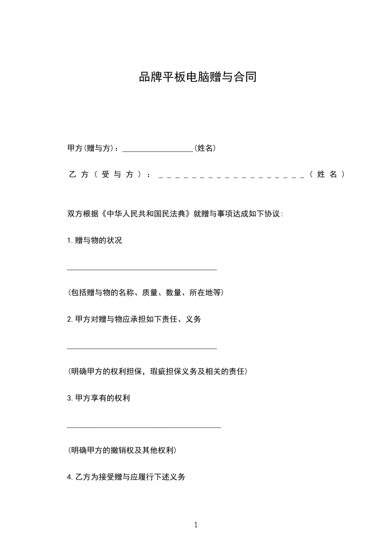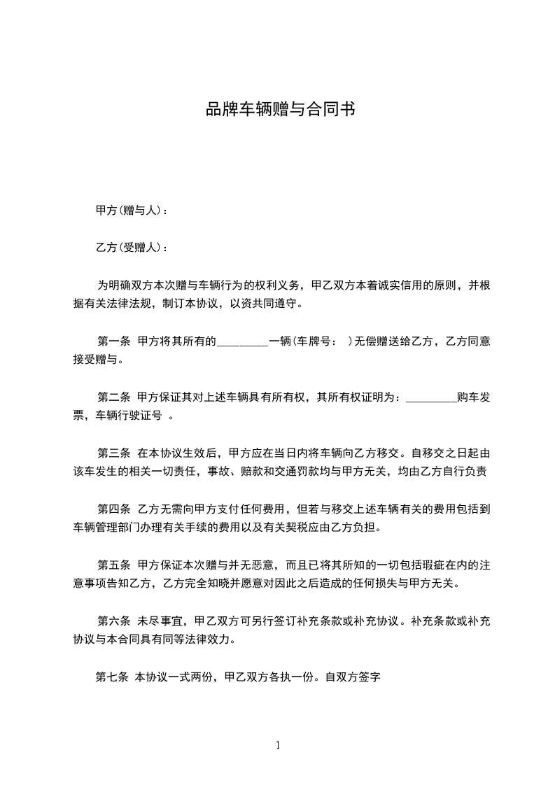 一、甲方将其所有的_________(标的物)赠送给乙方,其所有权证明为:(写明证明甲方拥有所有权的证据名称,如赠与房屋,就应有房产所有权证,赠与微机应有购买该微机的发票等)