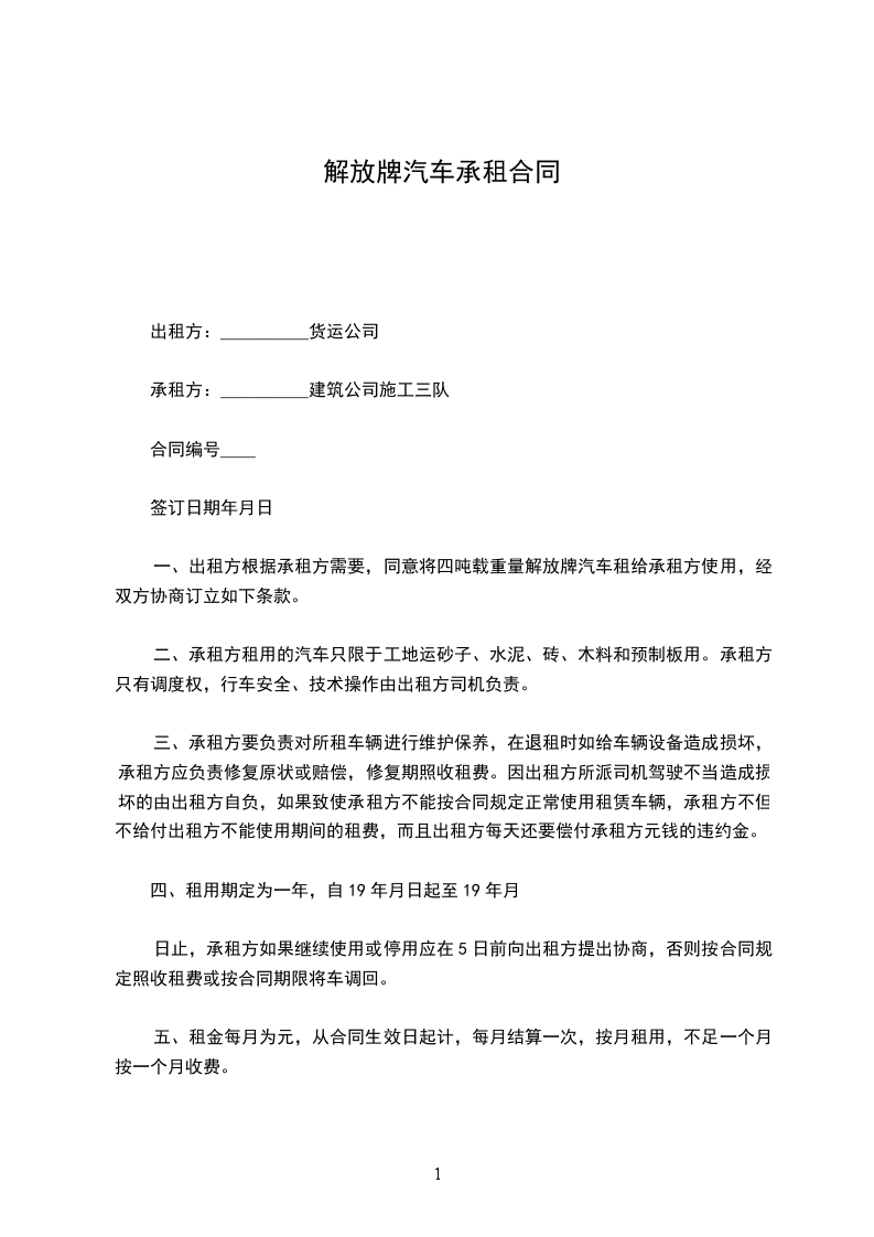 一、出租方根据承租方需要,同意将四吨载重量解放牌汽车租给承租方使用,经双方协商订立如下条款。