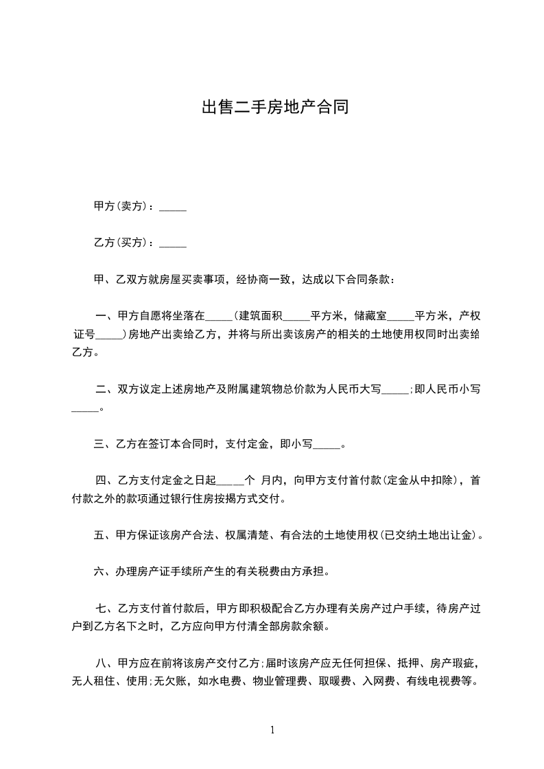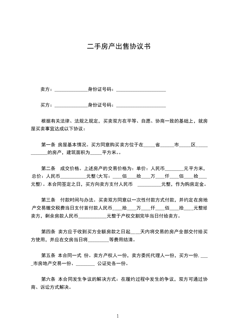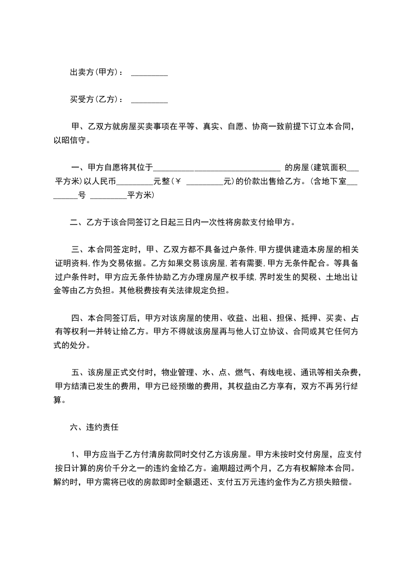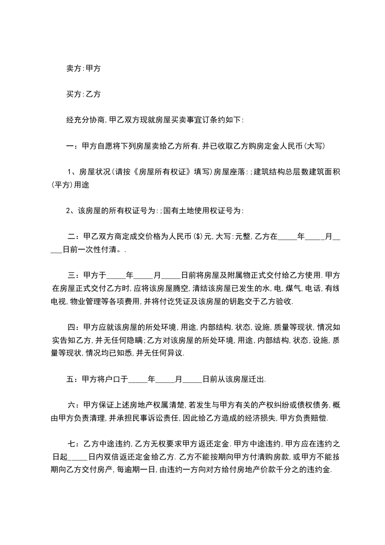 一:甲方自愿将下列房屋卖给乙方所有,并已收取乙方购房定金人民币(大写)