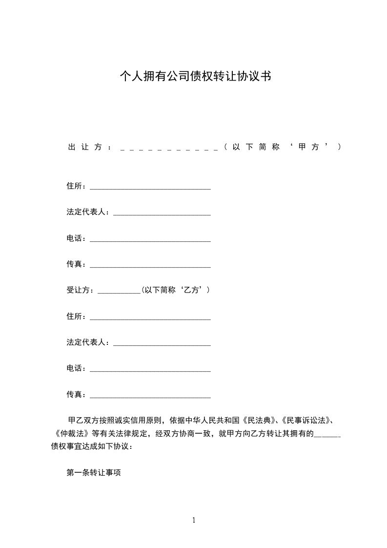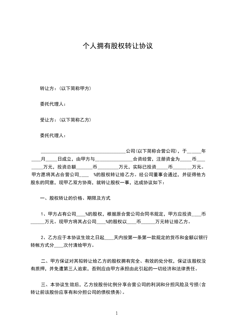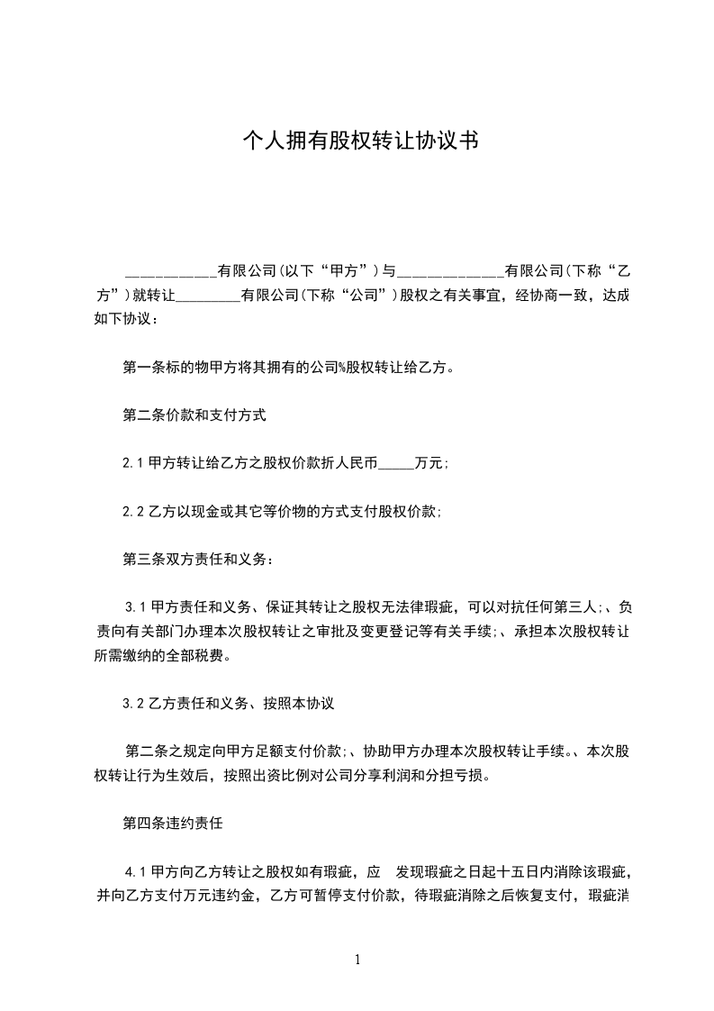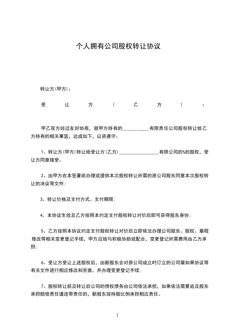 1、转让方(甲方)转让给受让方(乙方)_________________有限公司的_____%的股权,受让方同意接受。
