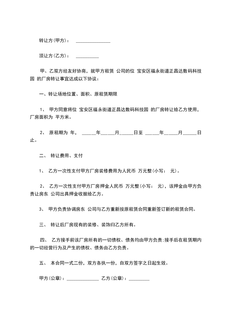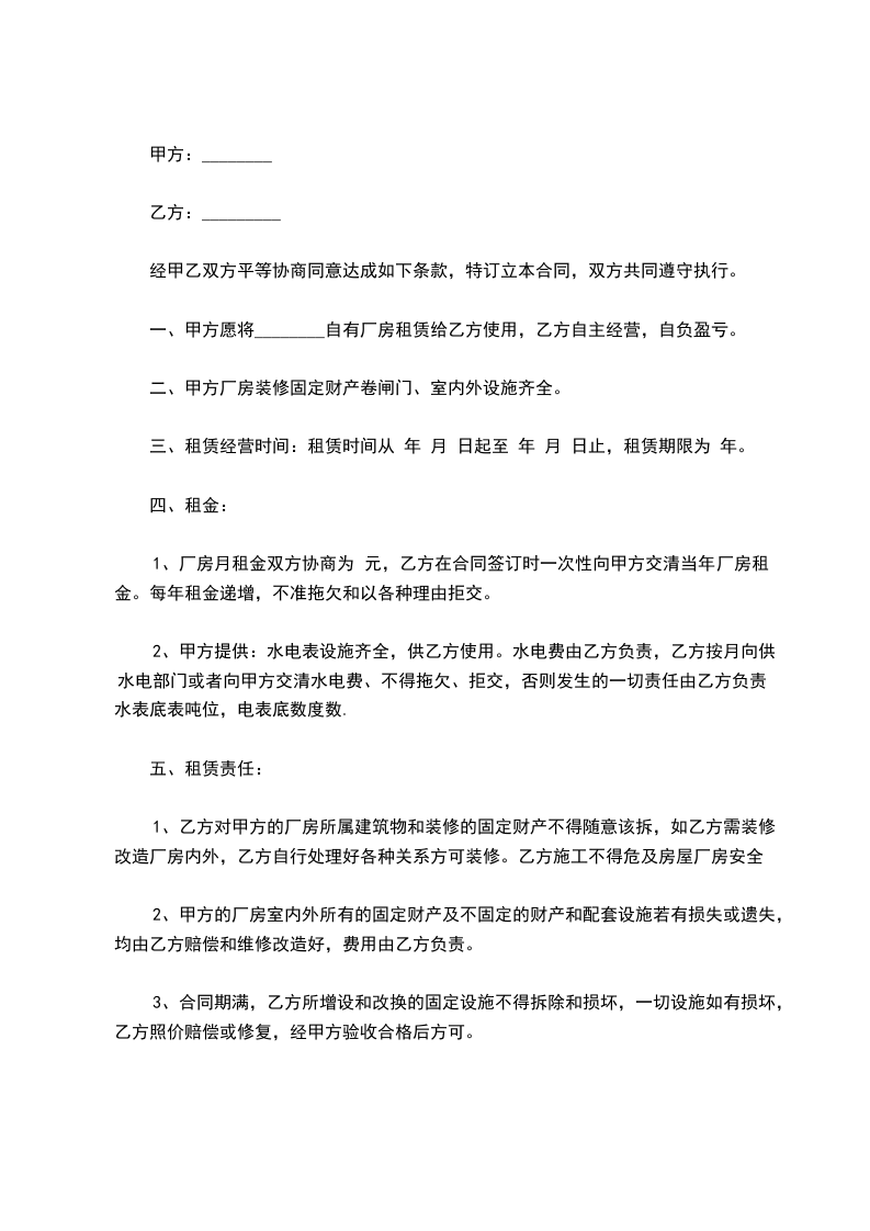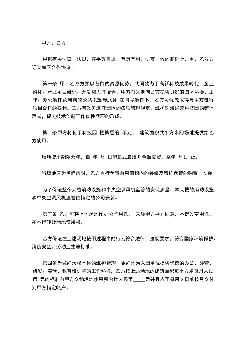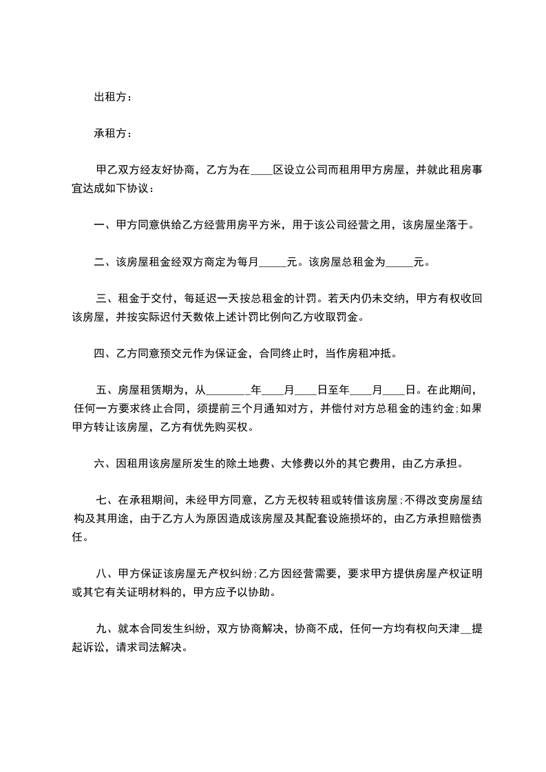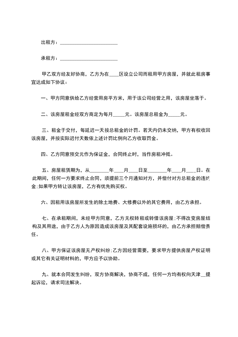 一、甲方同意供给乙方经营用房____平方米,用于该公司经营之用,该房屋坐落于____.