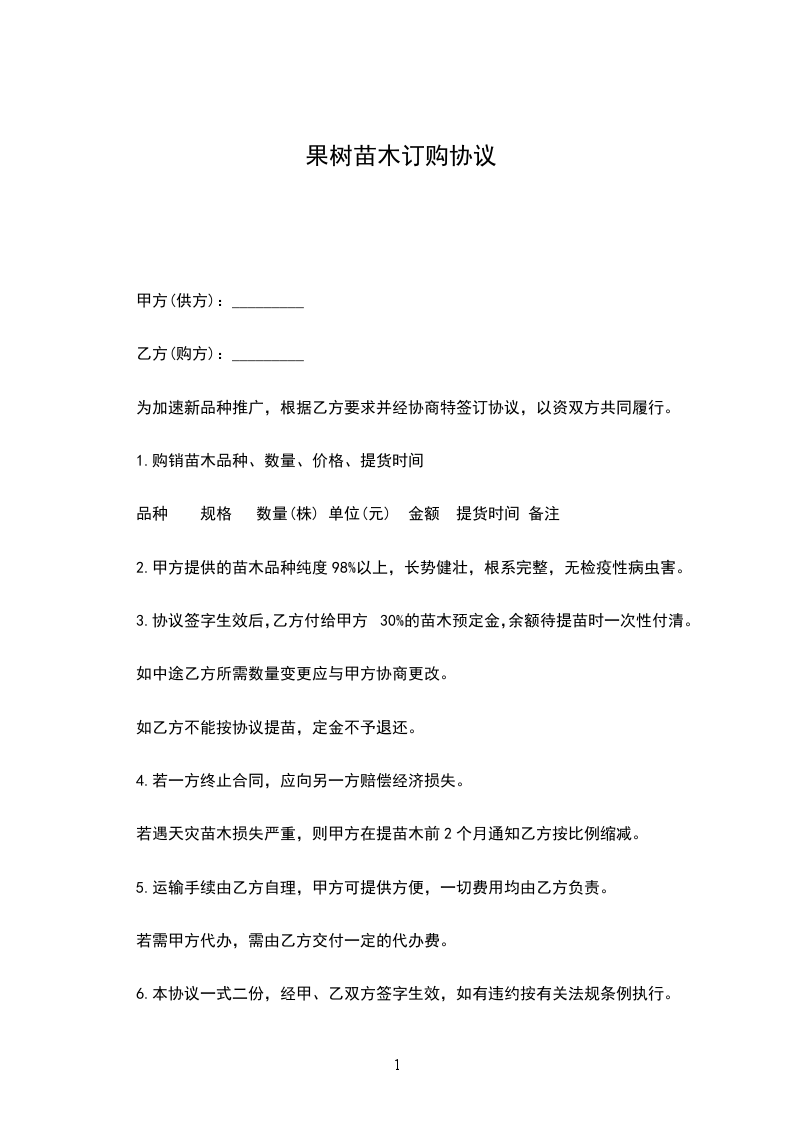 3.协议签字生效后,乙方付给甲方30%的苗木预定金,余额待提苗时一次性付清。