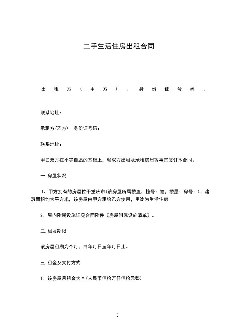 1、甲方拥有的房屋位于重庆市(该房屋所属楼盘,幢号:幢,楼层:房号:),建筑面积约为平方米,该房屋由甲方租给乙方使用,用途为生活住房。