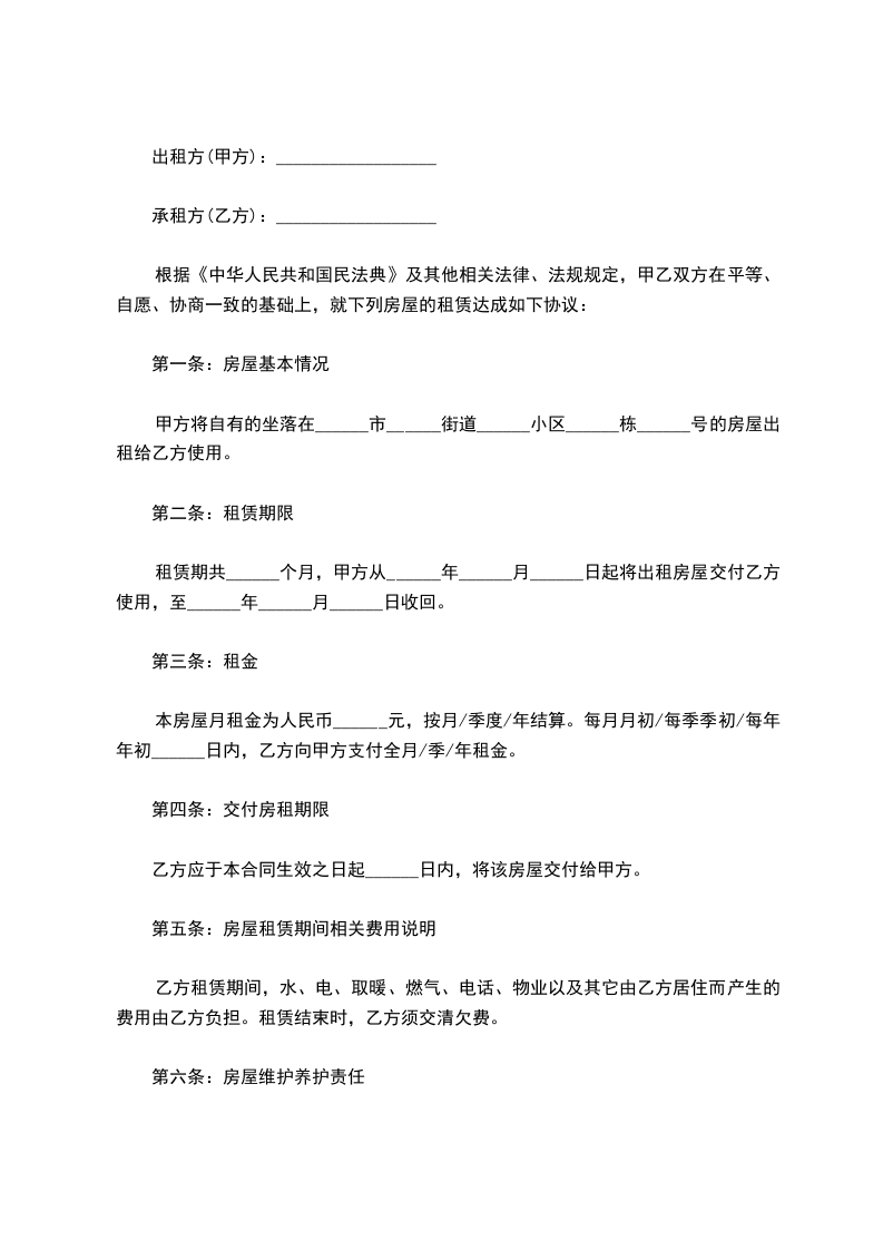 6、乙方如需对该房屋进行装修,必须经甲方同意后方可实施。乙方迁出时,不得拆卸固定的装修设施,以维持该房屋的完整;在征得甲方同意的情况下,乙方可进行拆卸,但必须将该房屋恢复原状。