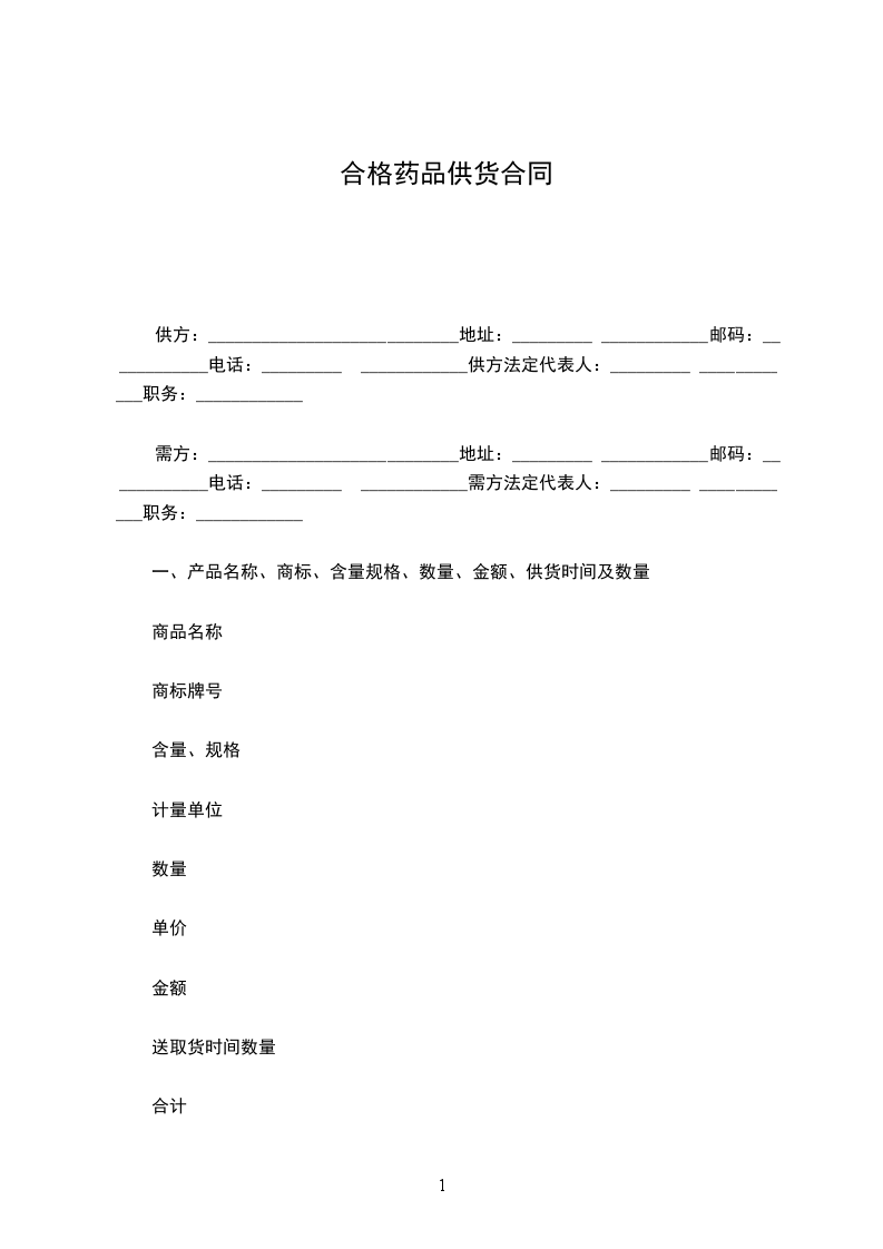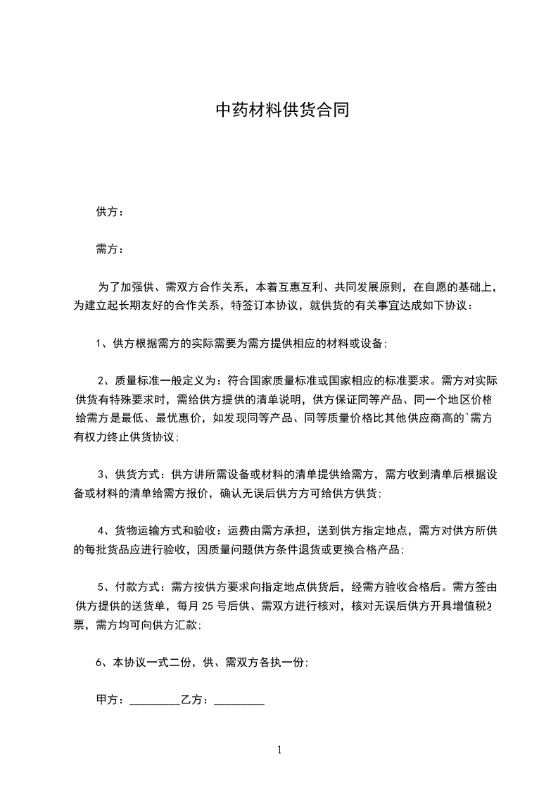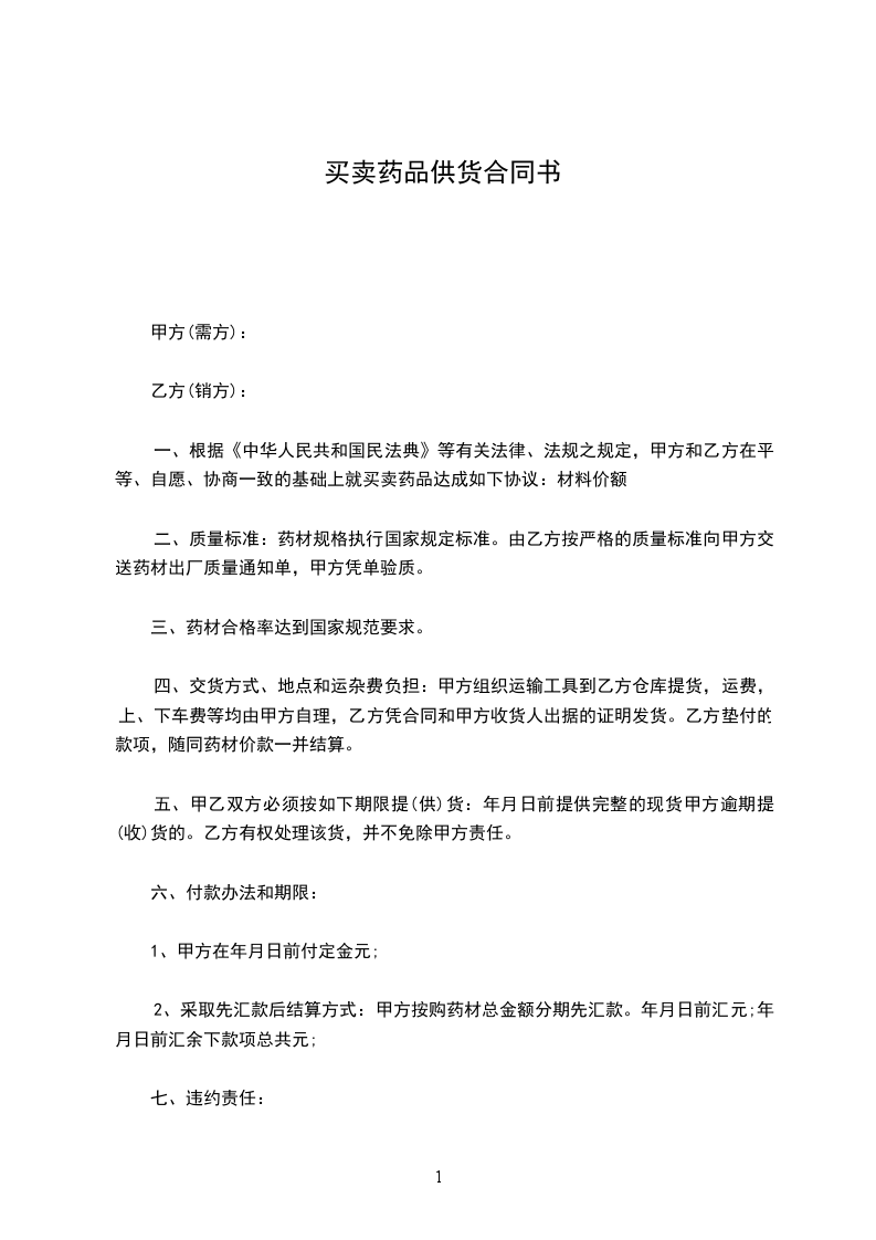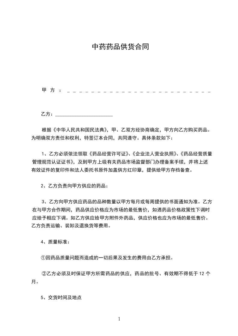 根据《中华人民共和国民法典》,甲、乙双方经协商确定,甲方向乙方购买药品。为明确双方责任和权利,特签订本合同,共同遵守。具体条款如下: